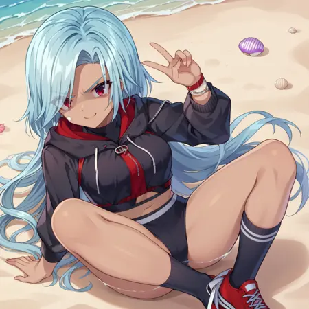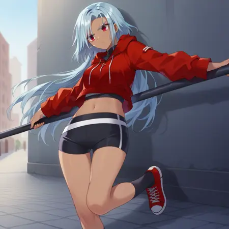 trisha, trishaalt, navel, hood, sneakers, socks, dark skin, red eyes, shoes, midriff, black socks