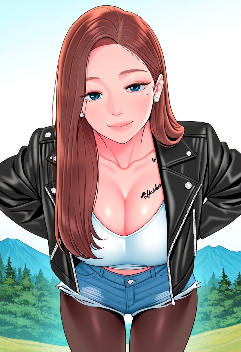 Nam Jeong-Ah:nam_jeong-ah、美しい蒼色の瞳、美しい赤茶色の髪、美しい長い髪、巨大でふわふわした胸、(左目下のほくろ)、(腰の下部に蝶のタトゥー)、(左胸のテキストタトゥー)、(左骨盤部に黒い鳥と共にテキストタトゥー)、