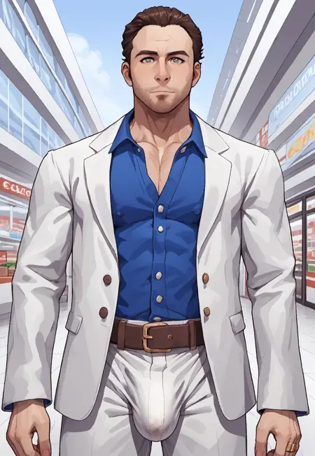 _白いジャケット、青いシャツ、白いパンツ、指輪、ベルト、