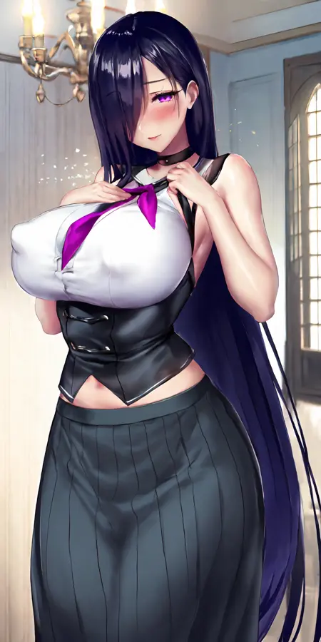 Main tag: nydia, black hair, purple eyes, very long hair, large breasts