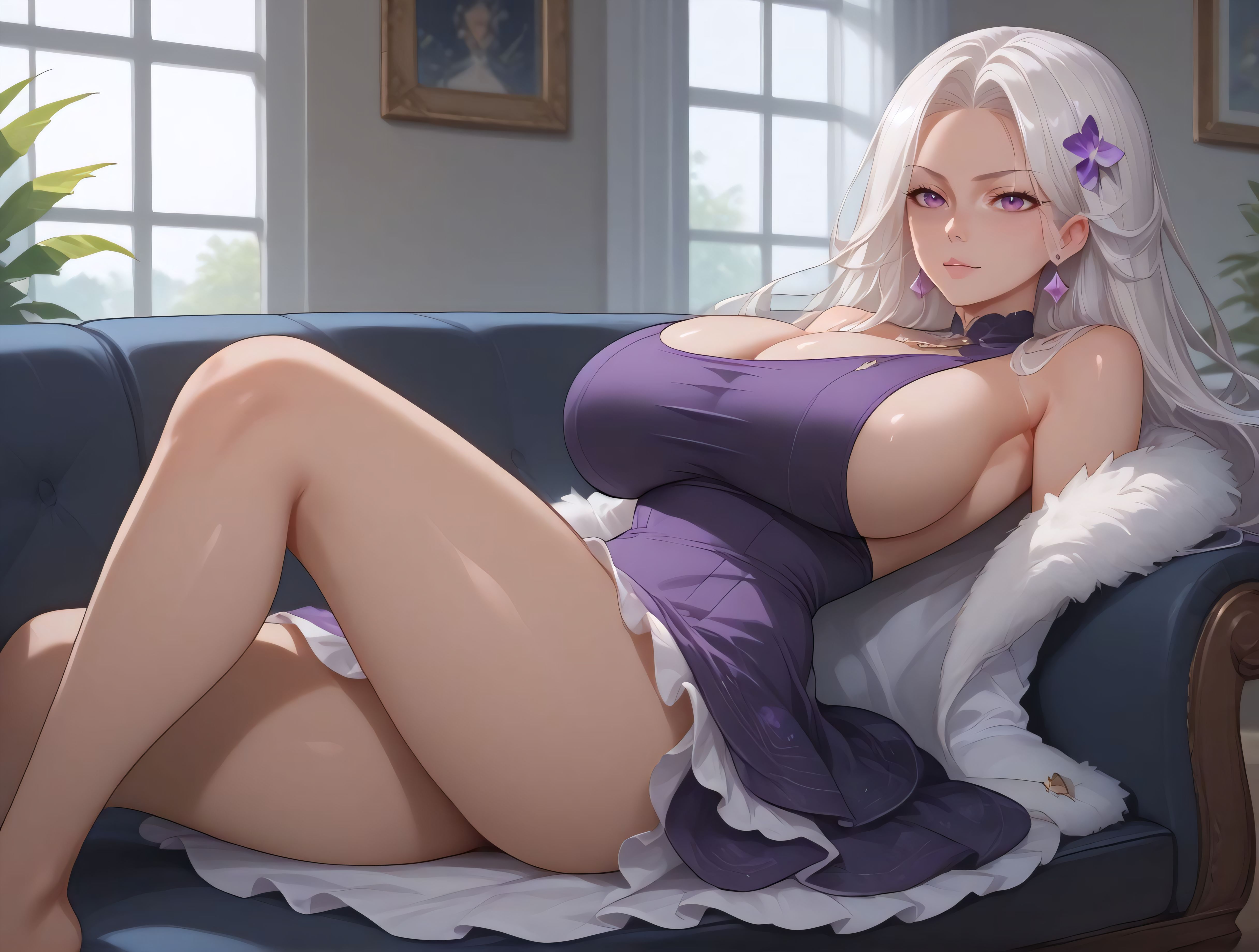 Appearance: huge breasts, sagging breasts, white hair, purple eyes, long hair,