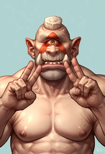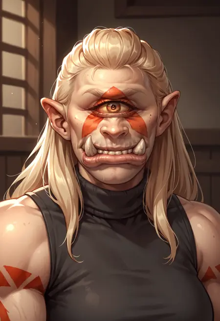 1boy, 肌肉发达, 肌肉男性, 长牙, 独眼, 尖耳, 赤裸上身, 短裤