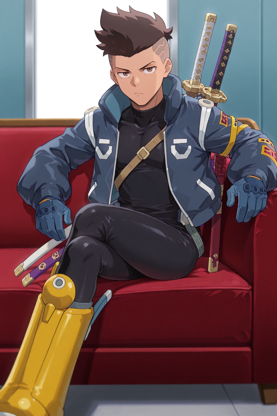 black bodysuit, blue jacket, blue gloves, yellow footwear