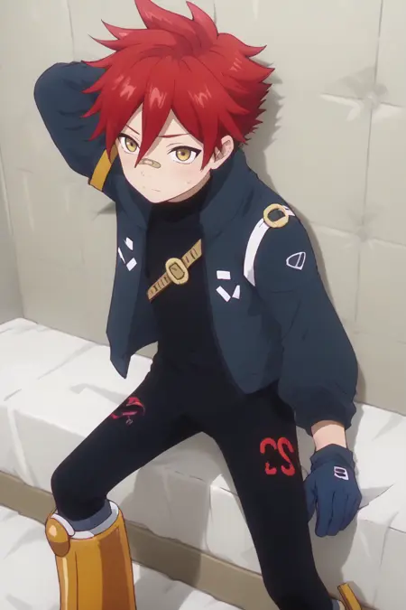 egg_outf, black bodysuit, blue jacket, blue gloves, yellow footwear