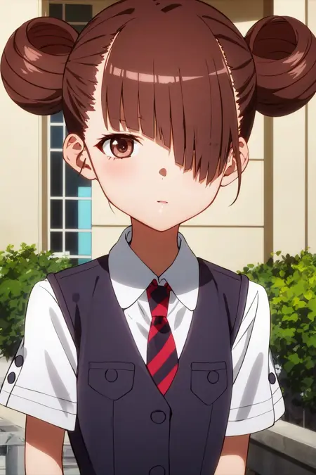 brown hair, asymmetrical bangs, hair over one eye, brown eyes, double bun