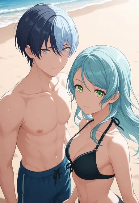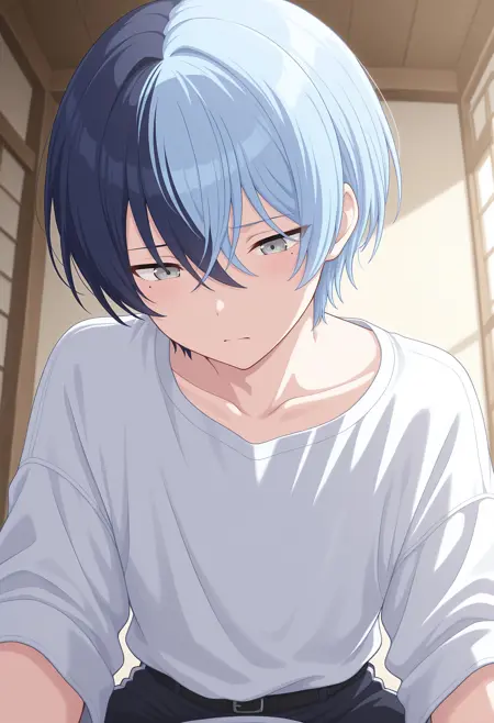split-color hair, two-tone hair, grey eyes, light blue hair, blue hair, male focus, toyakun