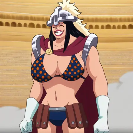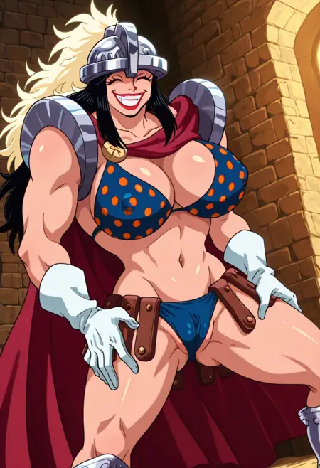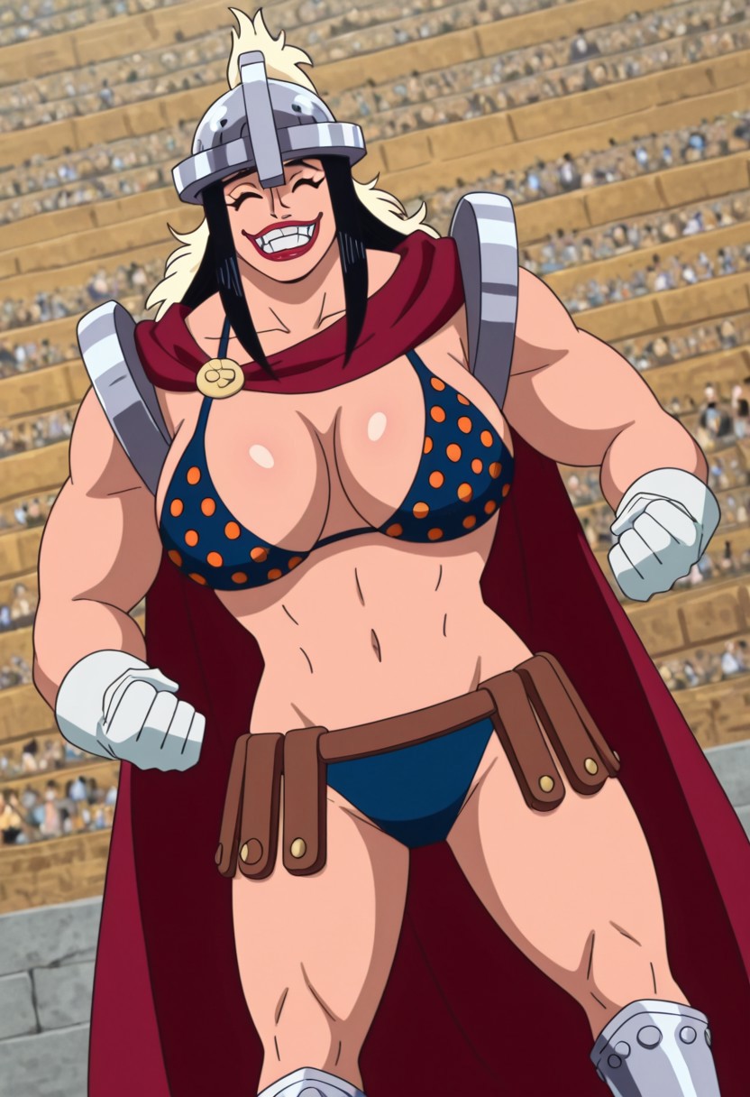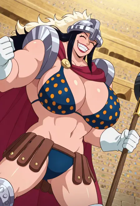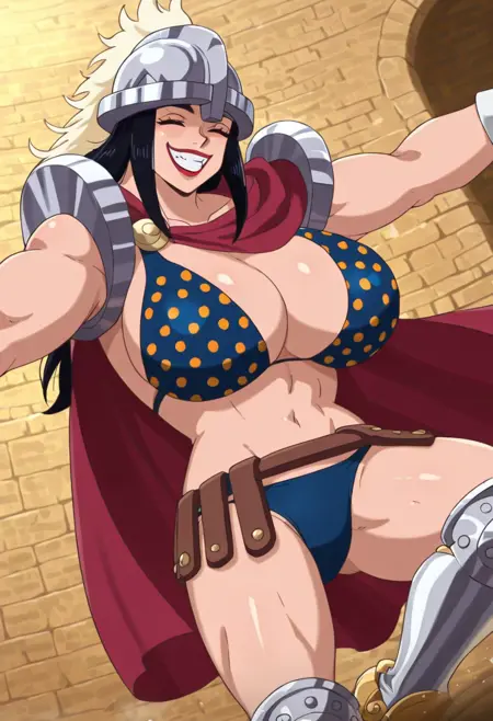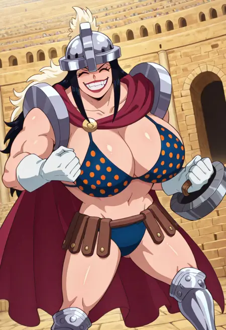AciliaOP,1个女孩,单独,肌肉女性,女性角斗士,黑发,长发,闭眼,嘴唇,鼻子,红唇,牙齿,带羽毛的银色头盔,红色斗篷,巨乳,乳沟,蓝色波点比基尼,肩甲,肚脐,腹部,腹股沟,蓝色内裤,锁骨,白色手套,角斗士腰带,二头肌,肌肉双腿,粗大腿,靴子,宽肩