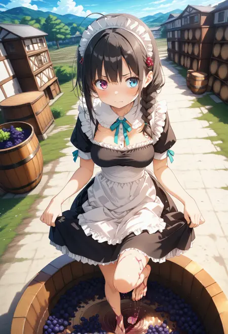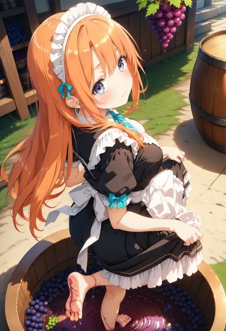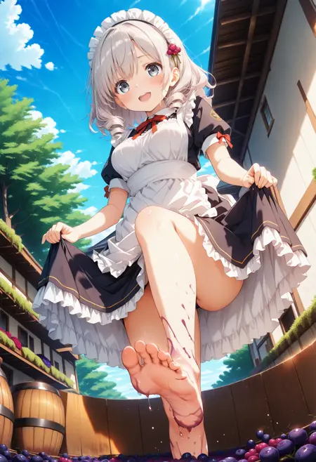 仅用触发词大体即可生成,建议从以下关键词中补充所需内容:barrel、barefoot、soles、outdoors、grapes、skirt hold、bare legs、leg up、standing on one leg、no shoes等。