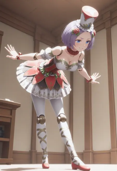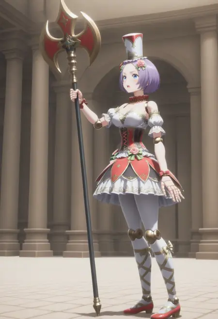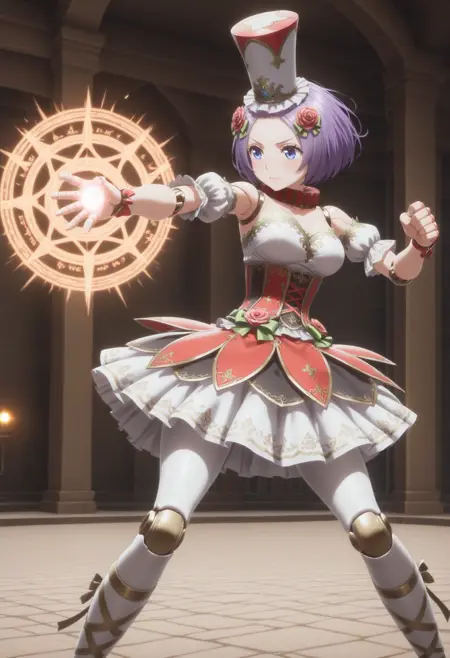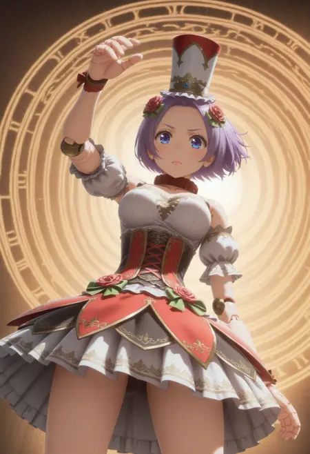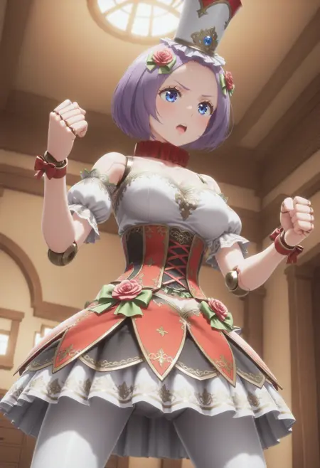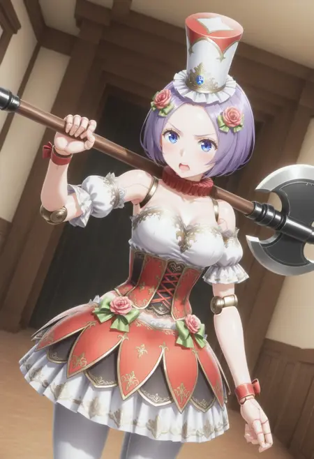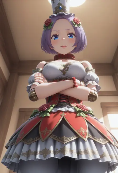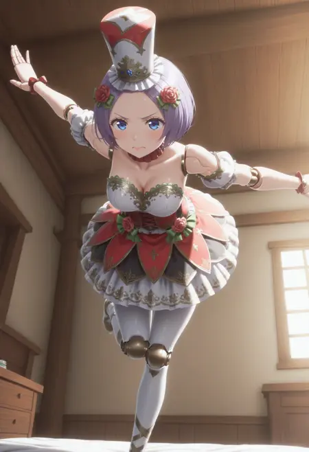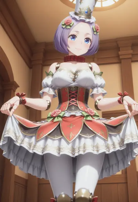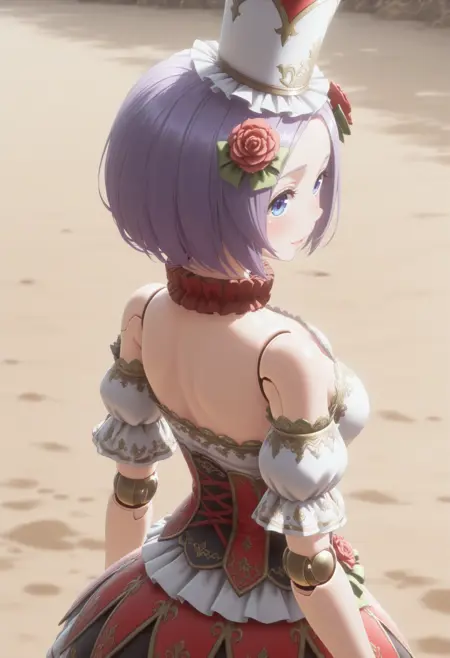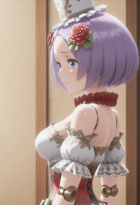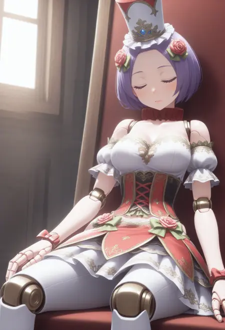트리거만으로는 대체로 문제가 없지만, blue eyes, joints, hat, short hair, doll joints, purple hair, hair flower, robot joints, detached sleeves, corset, collarbone, puffy sleeves, bare shoulders 중 필요한 요소를 추가하세요.