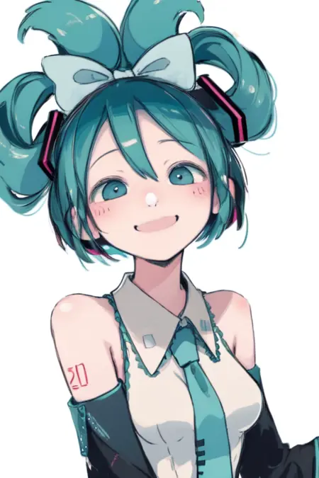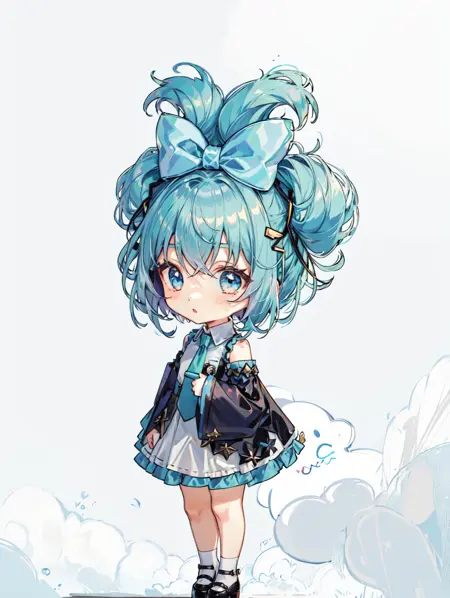 ✮触发词: Cinnamiku、蓝发(或水蓝色)、蓝眼、折叠双马尾、发髻、发环、发饰蝴蝶结、蓝色蝴蝶结、其他发型等..