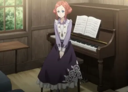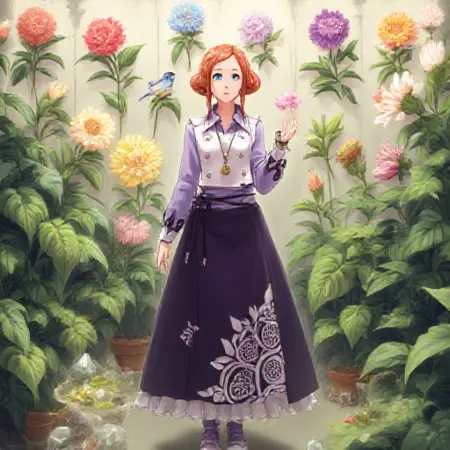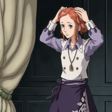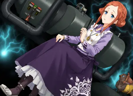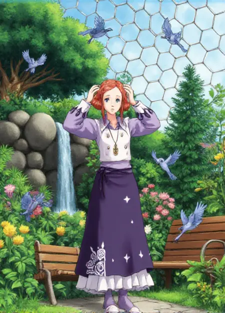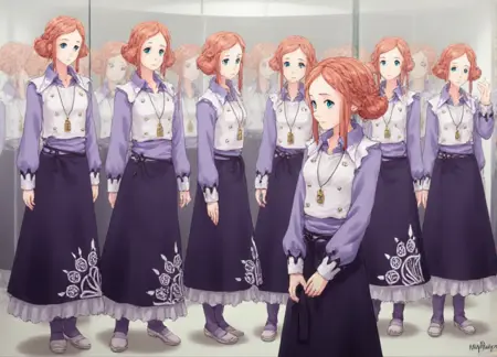 标准服装:“露娜有着下垂的蓝色眼睛和细长的眉毛。她的珊瑚橙色头发扎成一个发髻,并编有辫子,脸前两侧各垂下两缕长发,搭配短而侧扫的刘海。她身穿一件浅紫色长袖上衣,外搭白色背心,下穿一条深紫色长裙,裙摆附近饰有白色几何图案,腰间系有丝带。她还穿着紫色长筒袜和白色便鞋,左腕戴着一只大手镯,项链是一只笼中的蓝鸟。”