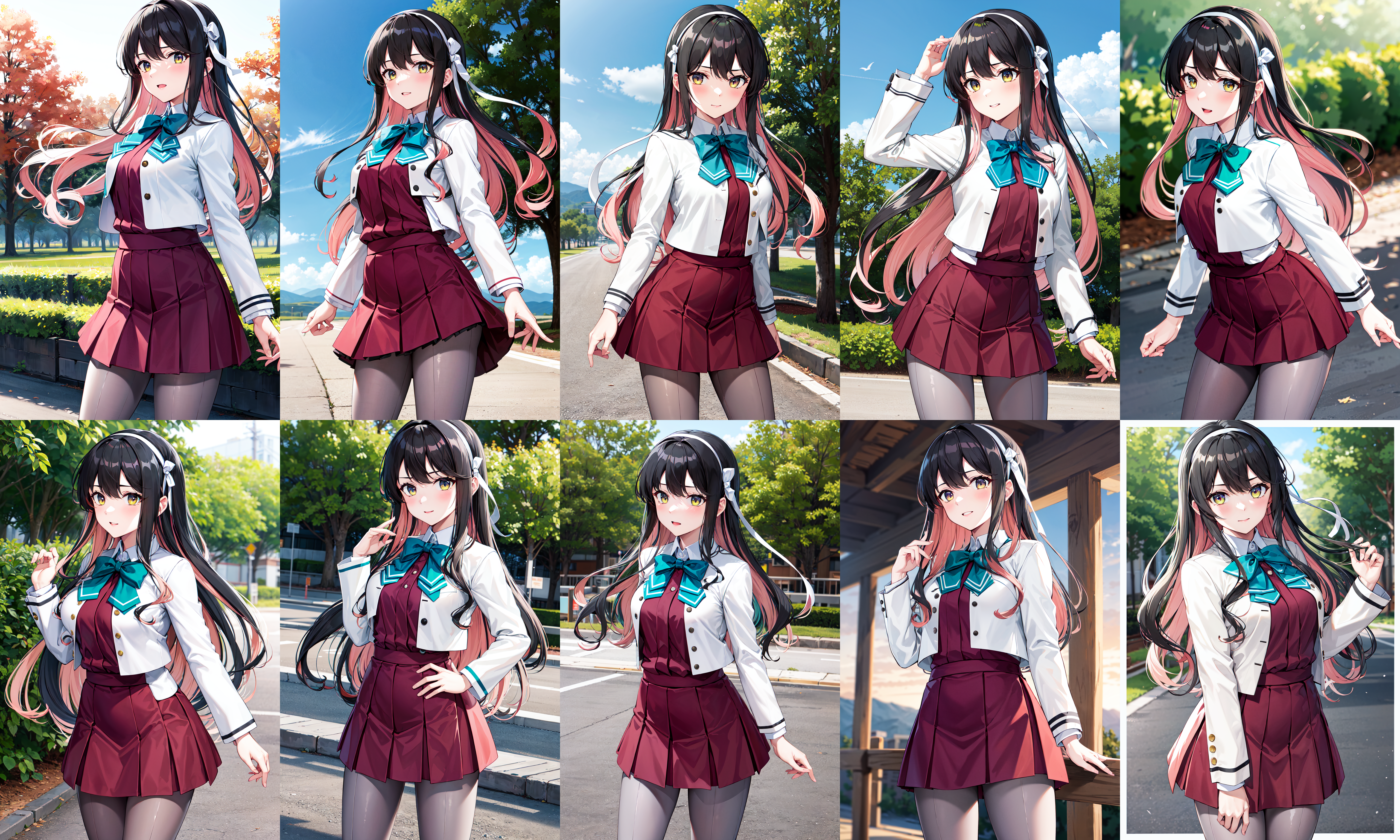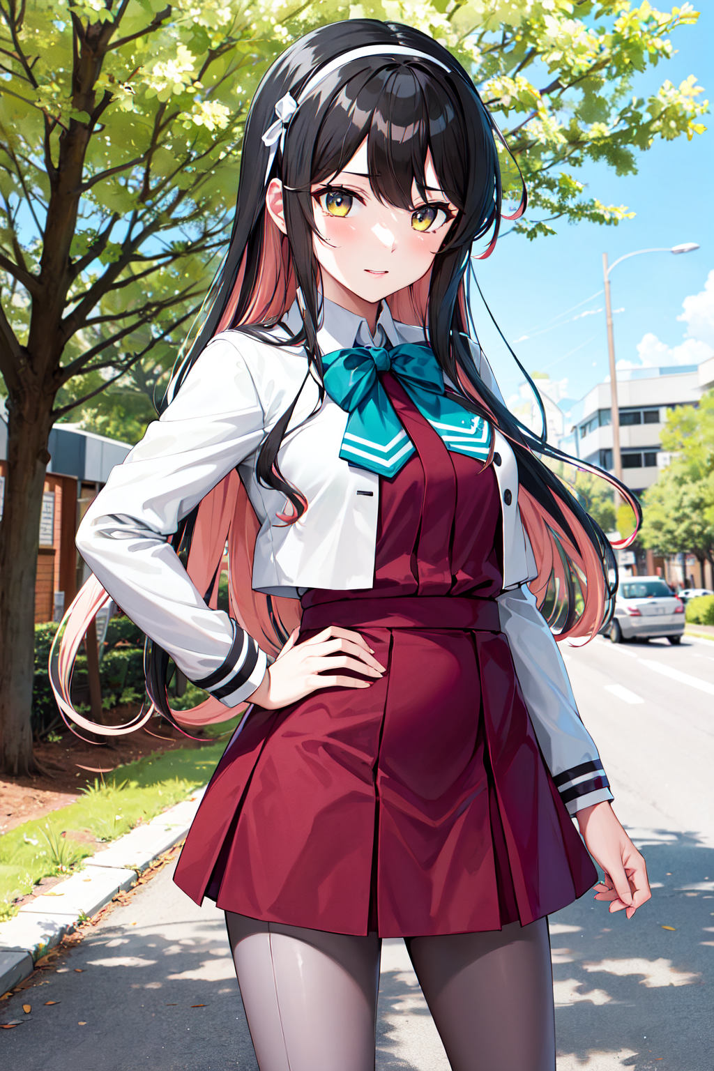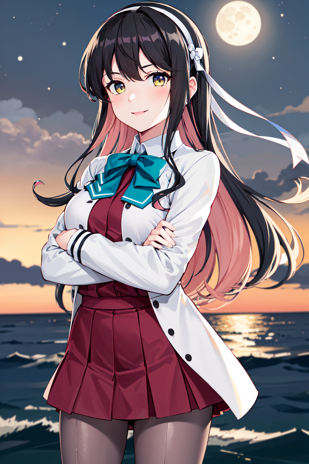 服装1hmngnm, naganami \(kancolle\), 多色头发, 白色发带, 白色夹克, 紫色连衣裙, 校服, 灰色连裤袜, 水蓝色蝴蝶结, 长袖