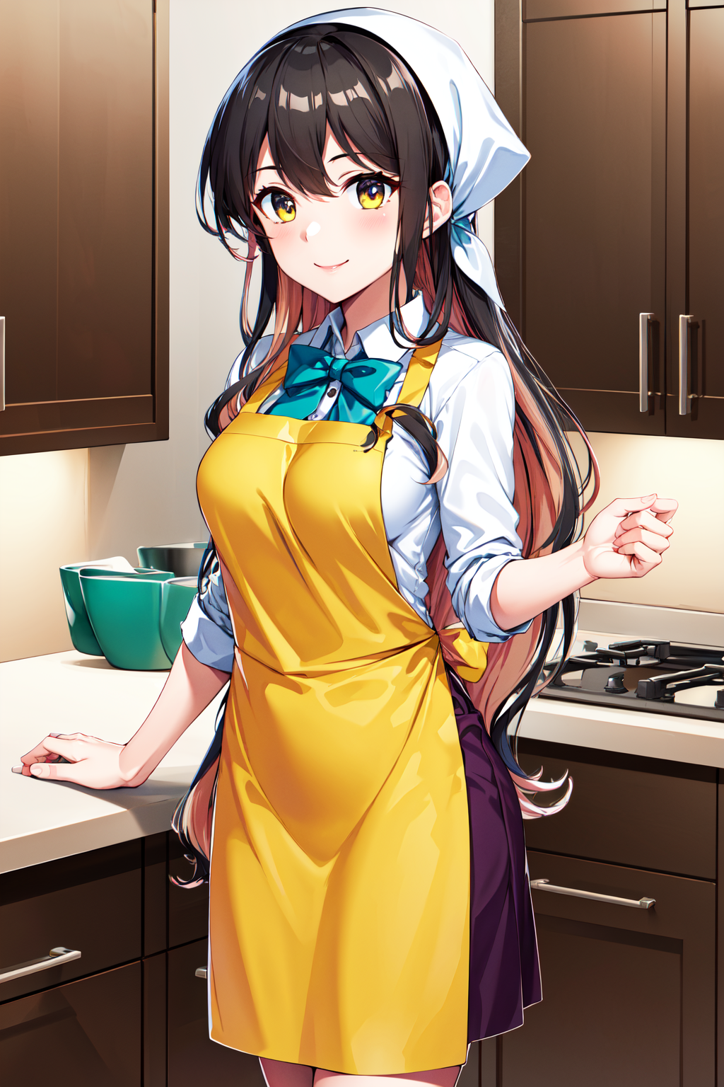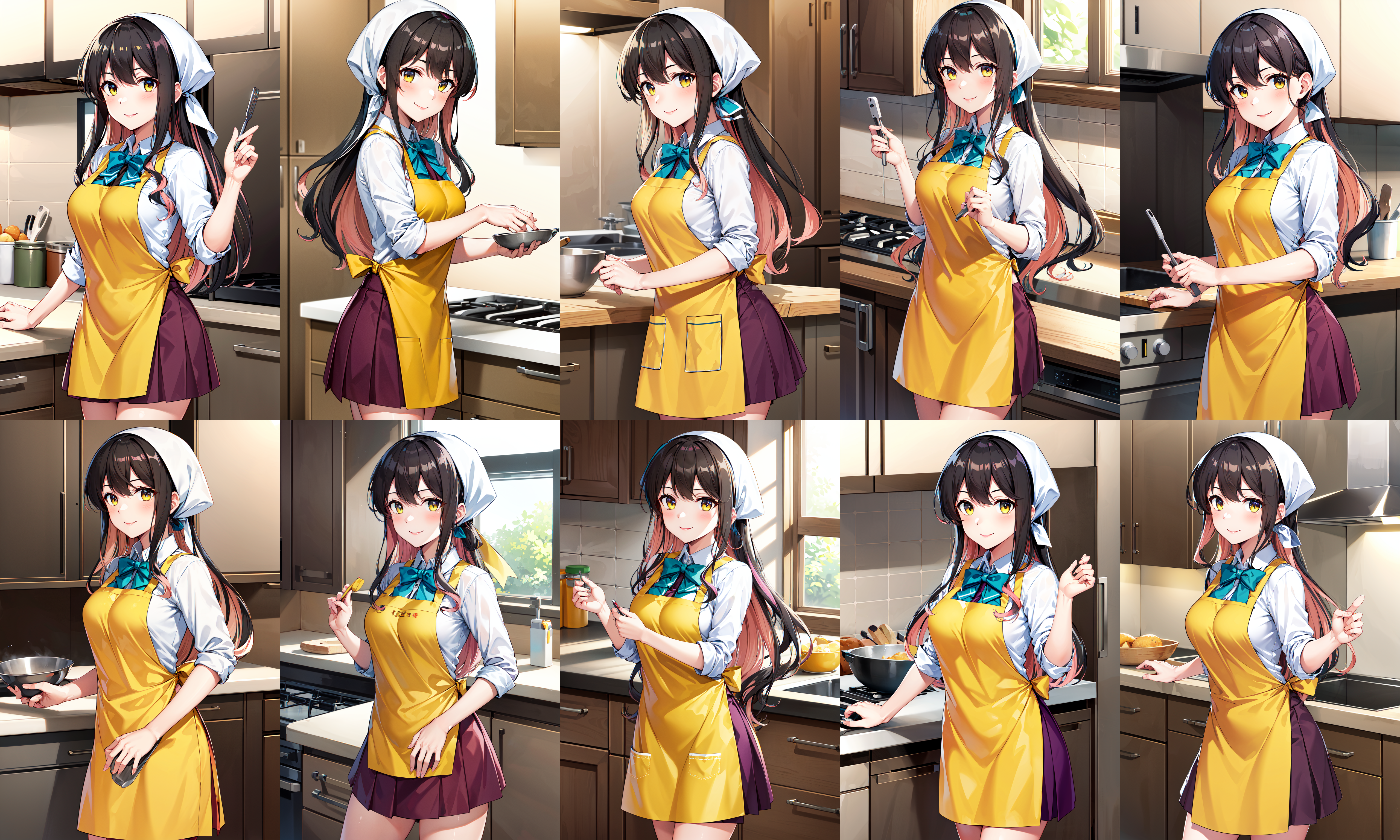 服装2hmngnm, naganami \(kancolle\), 多色头发, 头巾, 白色衬衫, 水蓝色蝴蝶结, 袖子卷起, 黄色围裙, 紫色短裙