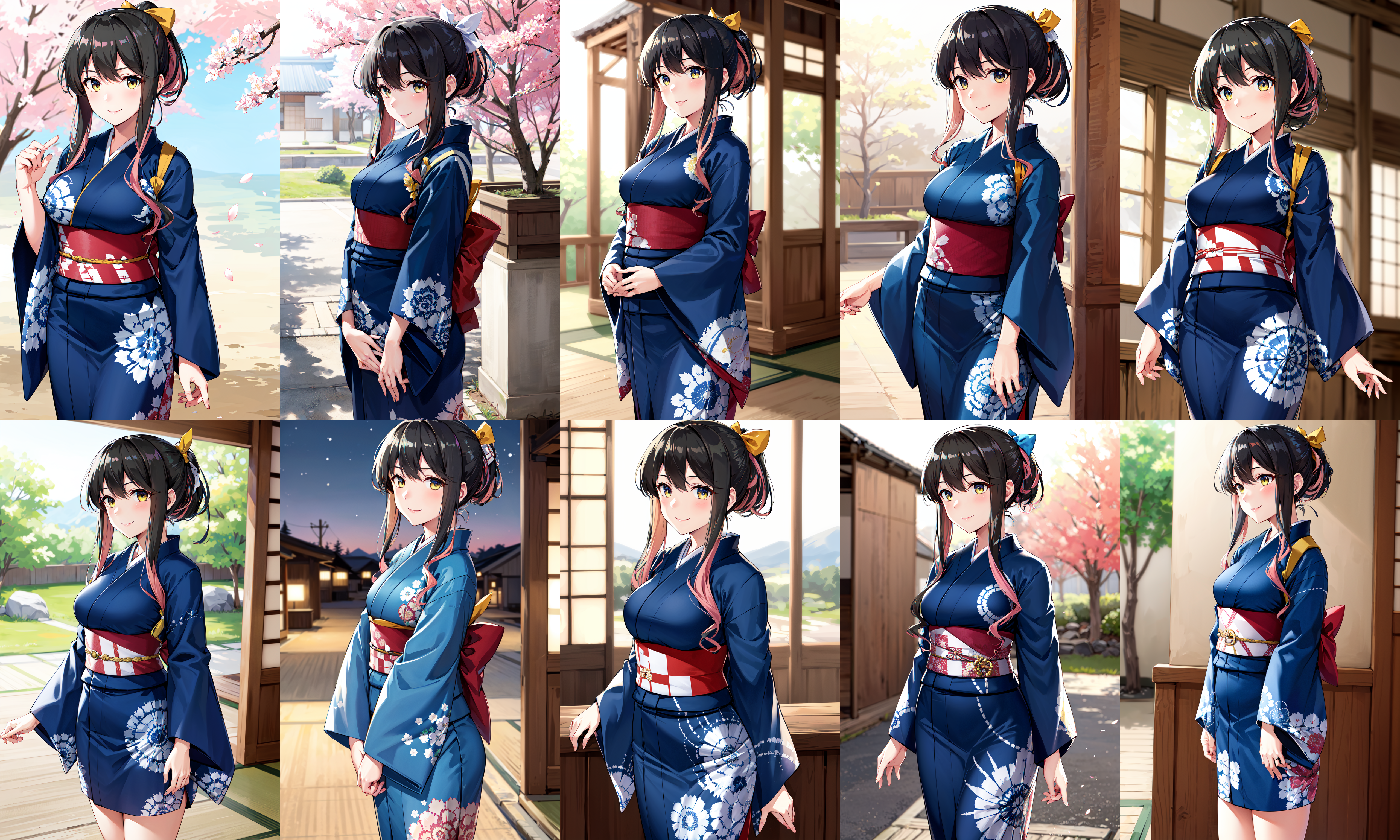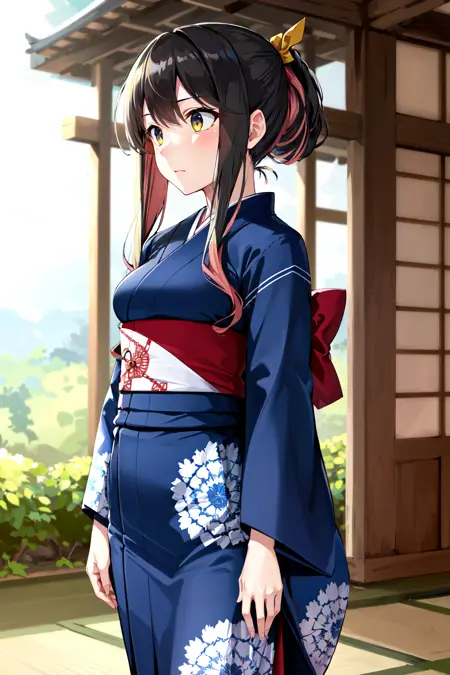 服装3hmngnm, naganami \(kancolle\), 多色头发, 马尾辫, 发带, 和服, 长袖蓝色和服, 花纹图案, 宽袖, 带腰带