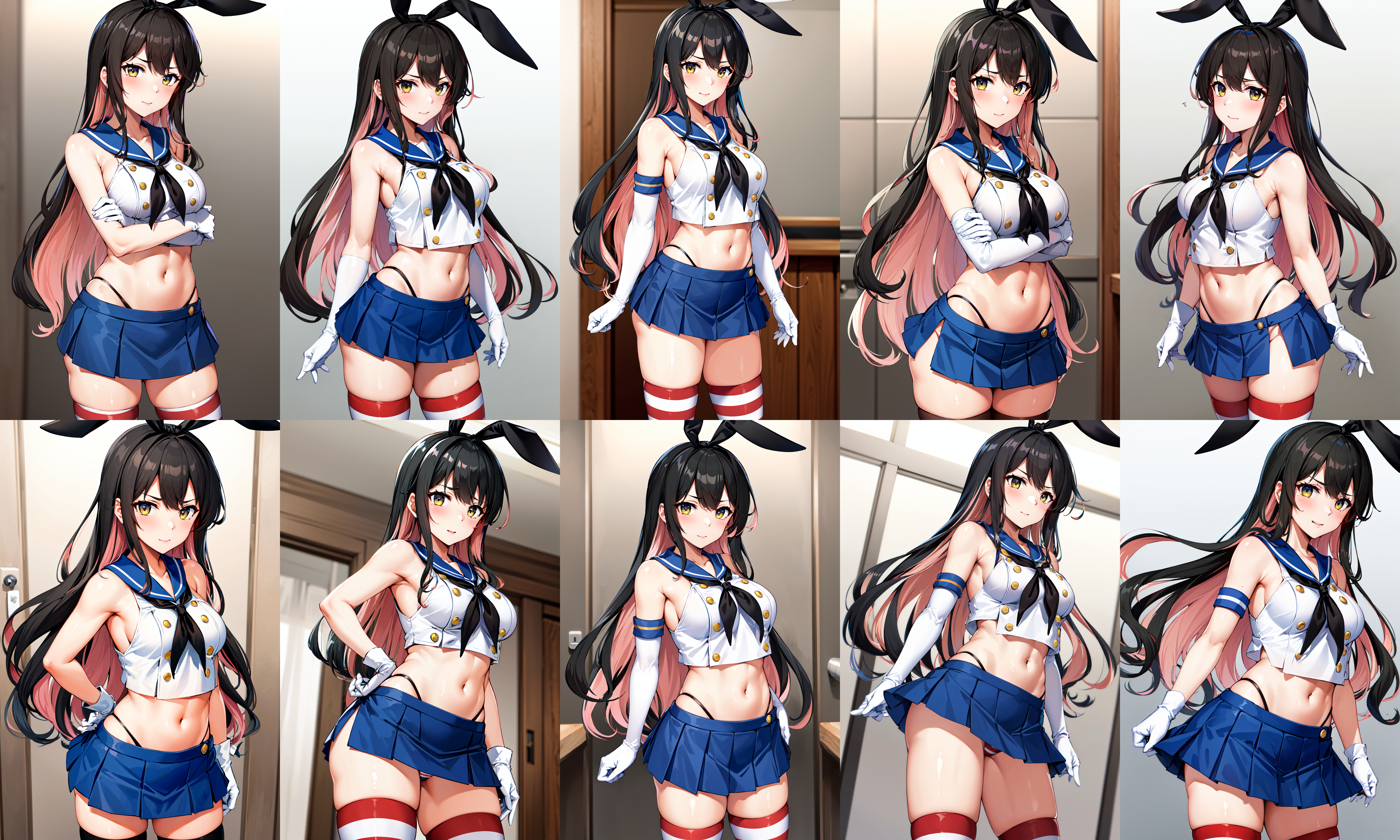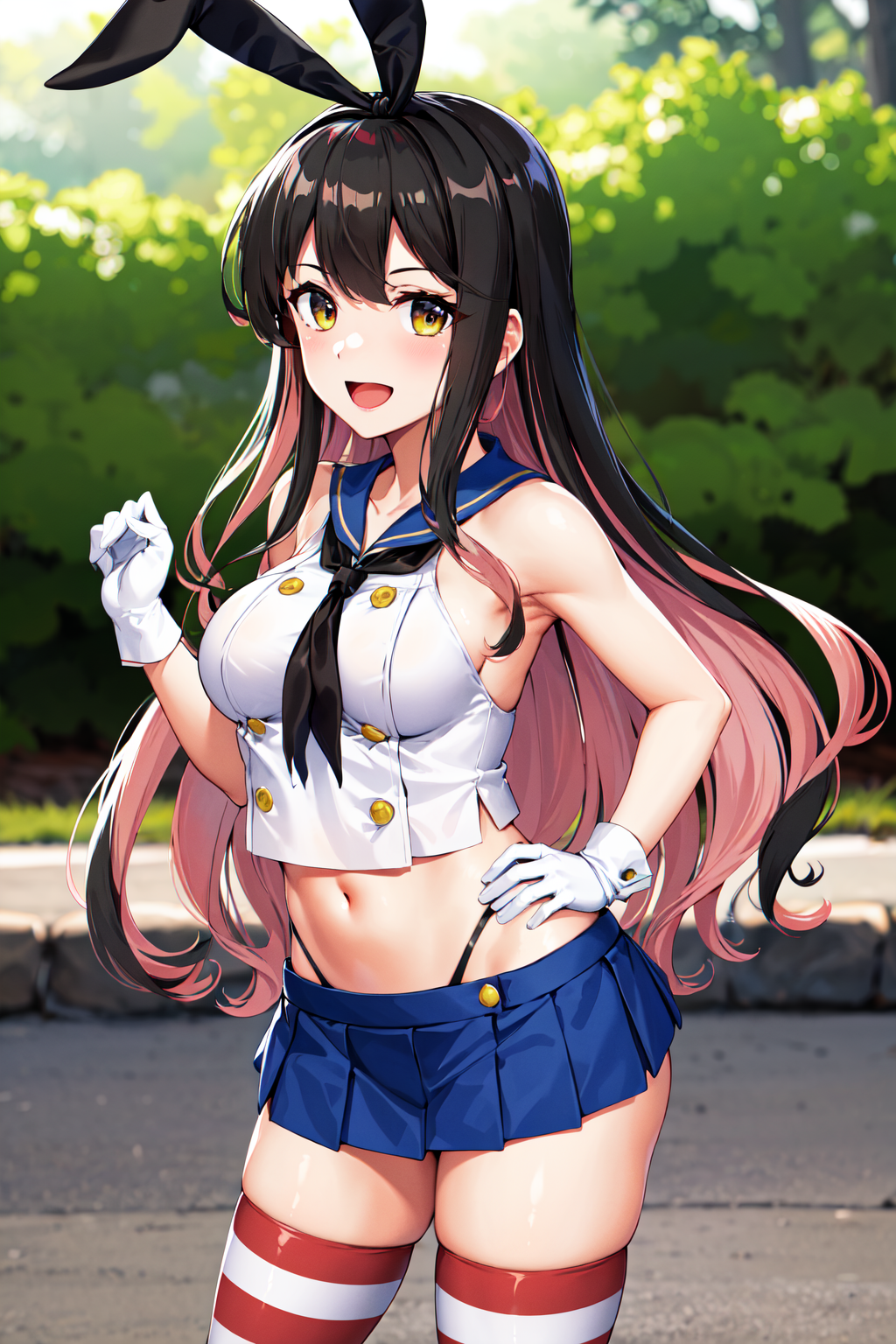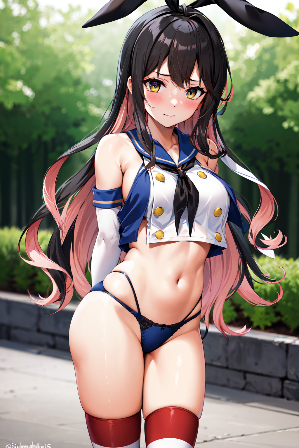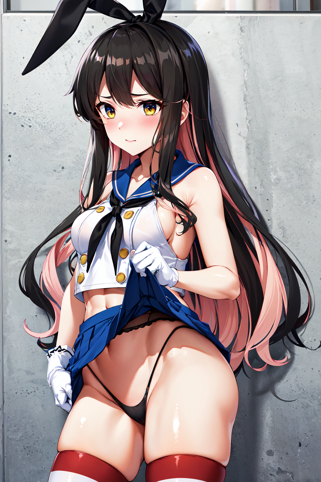 服装4hmngnm, naganami \(kancolle\), 多色头发, shimakaze (kancolle) (Cosplay), 短上衣, 无袖, 蓝色水手领, 黑色领巾, 白色手套, 蓝色短裙, 超短裙, 条纹长筒袜, 内衣