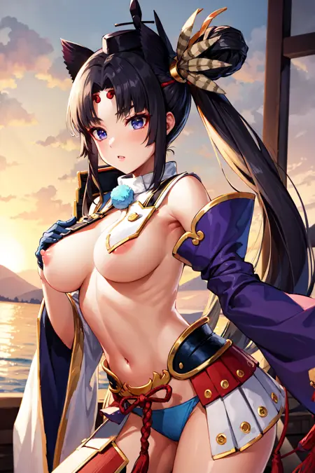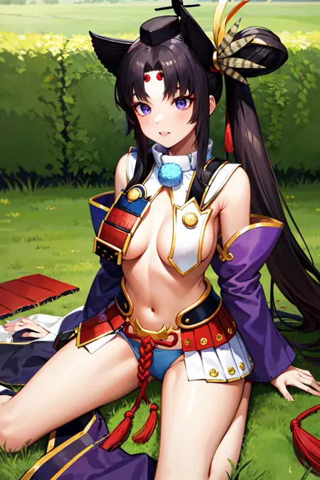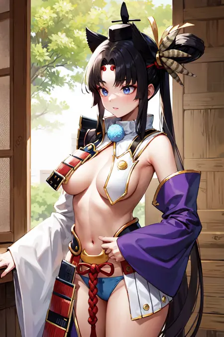 outfit1 (stage2 ver)hmushiwa、サイドポニーテール、長い髪、帽子、たてえぼし、羽根の髪飾り、日本甲冑、胸当、へそ、分離した袖、非対称な袖、白い袖、紫色の袖、ポンポン(衣装)、タッセル、青いパンツ、片手の手袋、片方のズボン腿