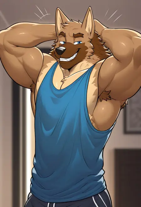 JacobPAF, 1boy, broad shoulders, mature male, blue eyes, athletic build, brown hair, anthro, wolf, animal ears, tan fur, scruffy