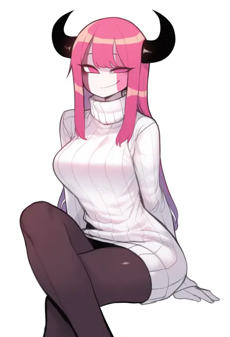 福音: 恶魔翅膀,修女服,恶魔角,粉色眼睛,无瞳孔,黑色紧身衣,心形镂空,黑色手套,肘部手套,黑色过膝袜