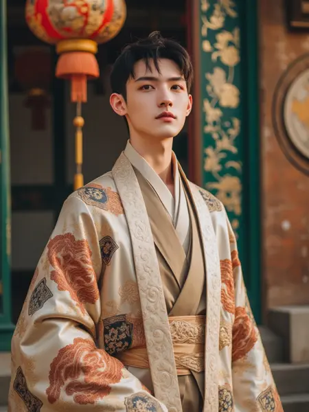 - 用户评价:中国风服饰,一名年轻亚洲男子,身着黑色和服,倚靠在一面裂开的墙边。他的头发短而黑,眼睛是锐利的蓝色。