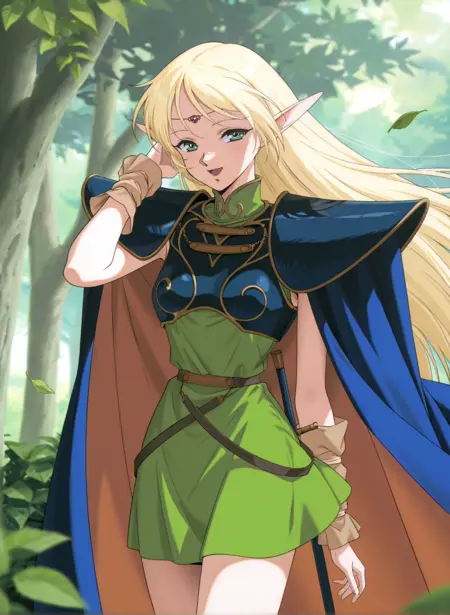 deedlit, blonde hair, pointy ears, long pointy ears, long hair, elf, green eyes,medium breasts