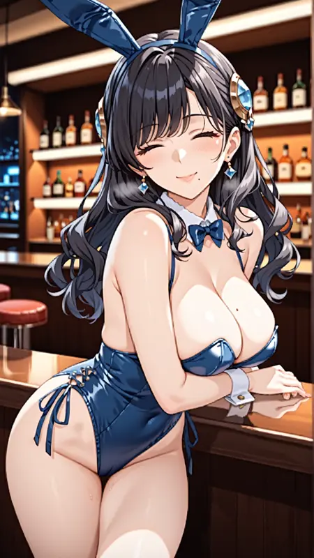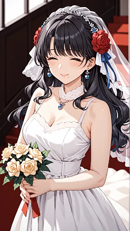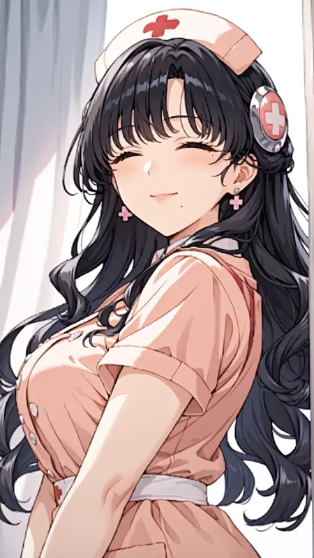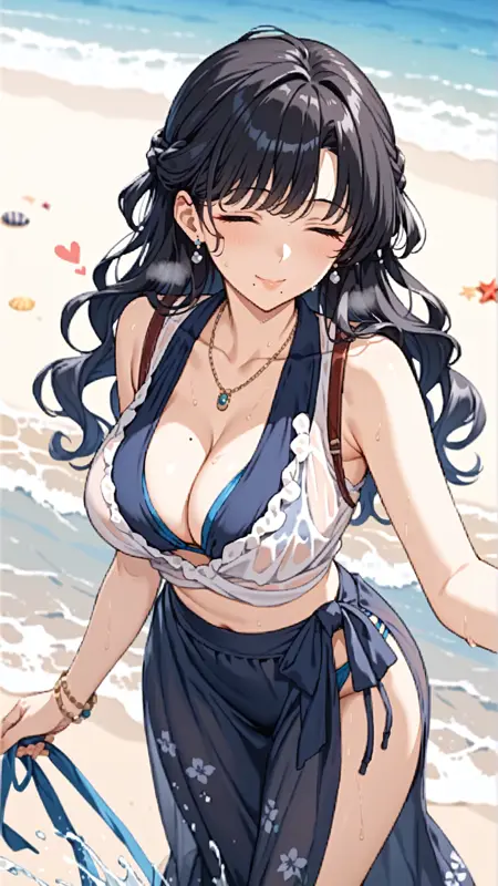 Appearance:black hair,long hair,wavy hair,mature,closed eyes, bangs,