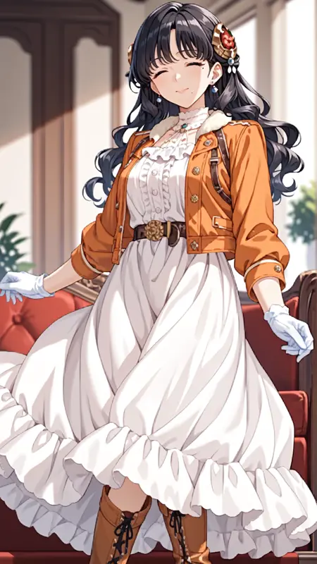 Outfit:hair ornament, dress, orange jacket, frills, white dress, gloves, white gloves, boots, brown footwear, belt,