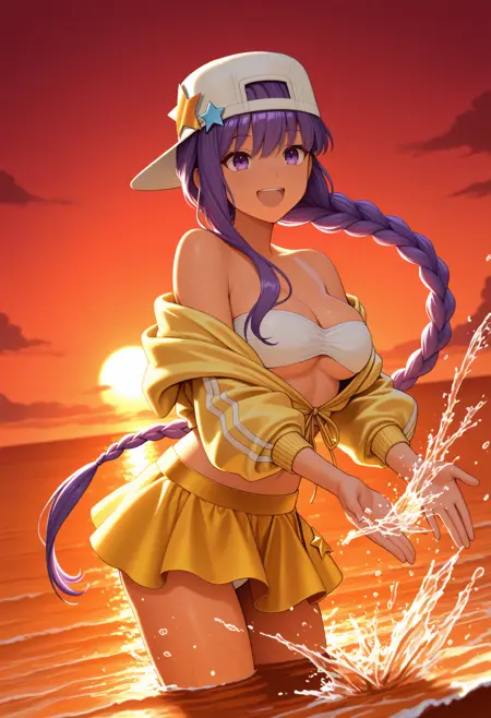 BBSummer, 보라색 눈, 보라색 머리, 매우 긴 머리, 한 줄 땋은 머리, 야구 모자, 뒤로 쓴 모자, 별 모양 모자 장식, 노란 재킷, 어깨 드러난 스타일, 흰색 비키니, 밴도, 노란 치마