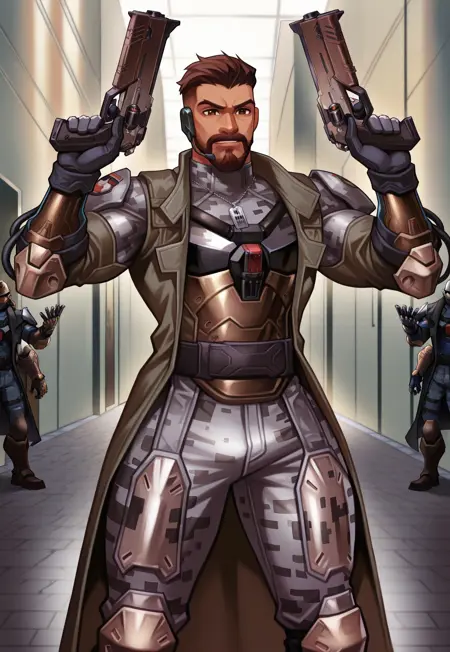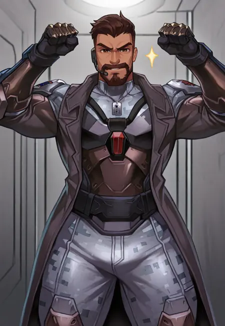 - 彼の兵士の衣装を生成する場合:24 outfit - reaper \(soldier: 24\) \(overwatch)\、ショートヘア、茶色の髪、茶色の目、アンダーカット、ひげ、アーマー、手袋、グレーのカモフラージュパンツ、名札、イヤホン、グレーのカモフラージュトップ、トレンチコート、ロングスリーブ、ガントレット