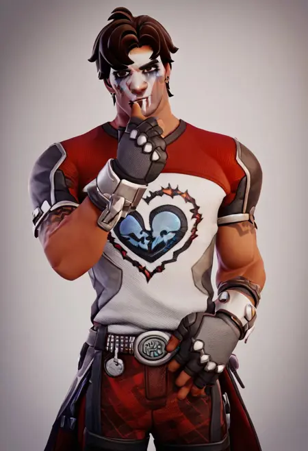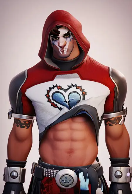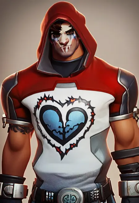 To generate his heartbreaker (the original) outfit - reaper \(heartbreaker\) \(overwatch\), short hair, black hair, brown eyes, scar on face, scar on cheek, heartbreaker, facepaint, red hood, shirt, black tattoo, fingerless gloves, bandaid, clothes around waist, belt, red pant, red devil wing