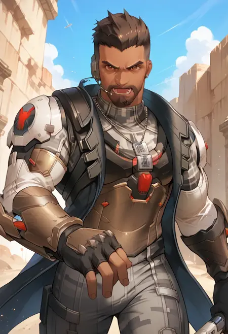 生成他的士兵装扮:24 出场 - 死神 \(soldier: 24\) \(守望先锋)\,短发,棕发,棕眼, undercut,胡须,盔甲,手套,灰色迷彩裤,身份牌,耳机,灰色迷彩上衣,风衣,长袖,护腕