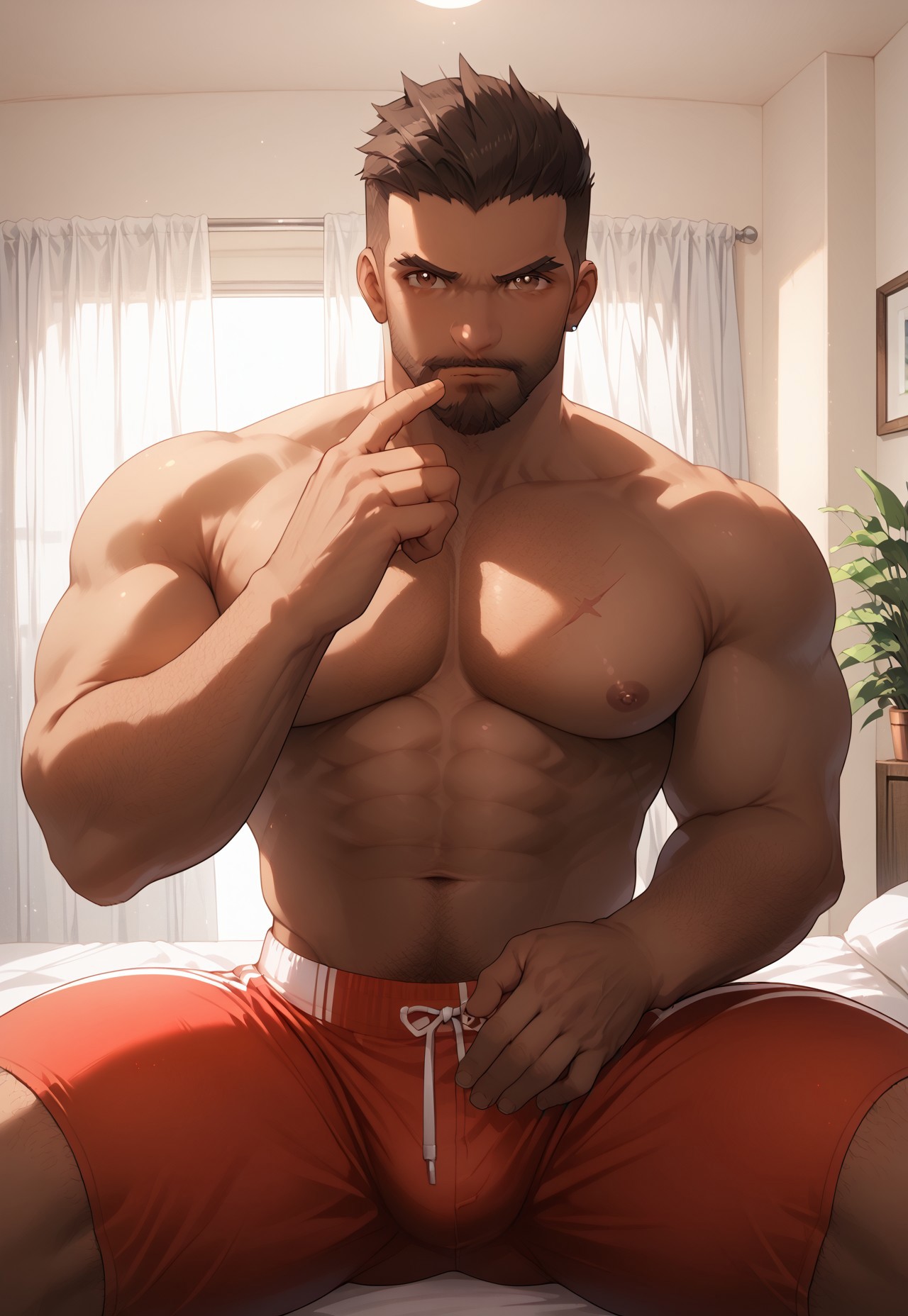 生成他的心碎者(原版)装扮 - 死神 \(heartbreaker\) \(守望先锋\),短发,黑发,棕眼,面部疤痕,脸颊疤痕,心碎者,面部彩绘,红头罩,上衣,黑色纹身,无指手套,创可贴,腰间衣物,腰带,红裤,红色恶魔之翼