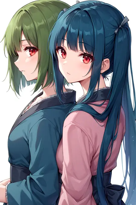 두 자매를 한 이미지에 생성하는 것은 가능하지만 다소 어렵습니다. 프롬프트에 "긴 머리카락"과 "짧은 머리카락"을 추가하는 것이 도움이 됩니다.