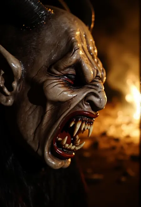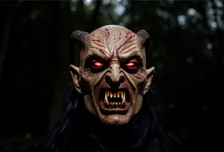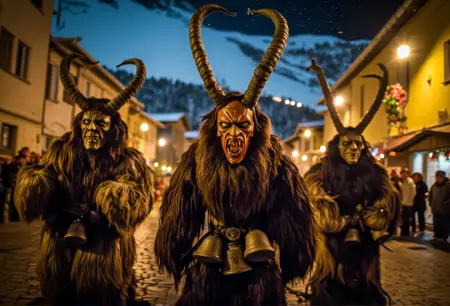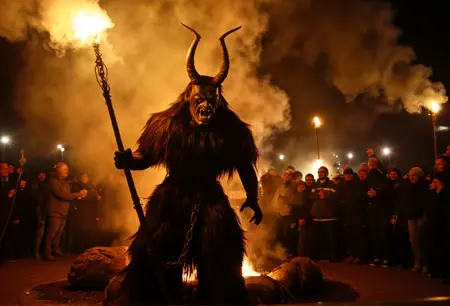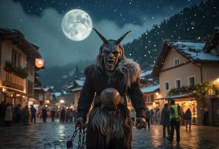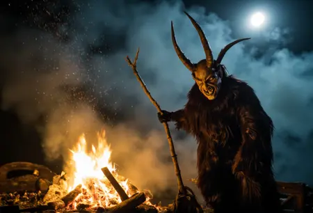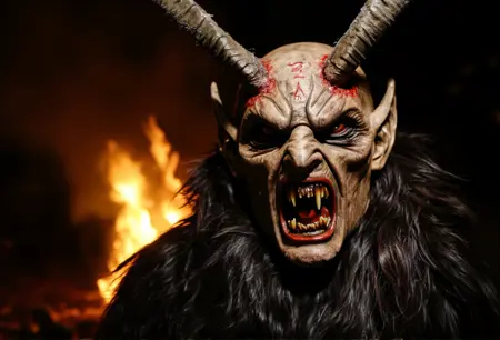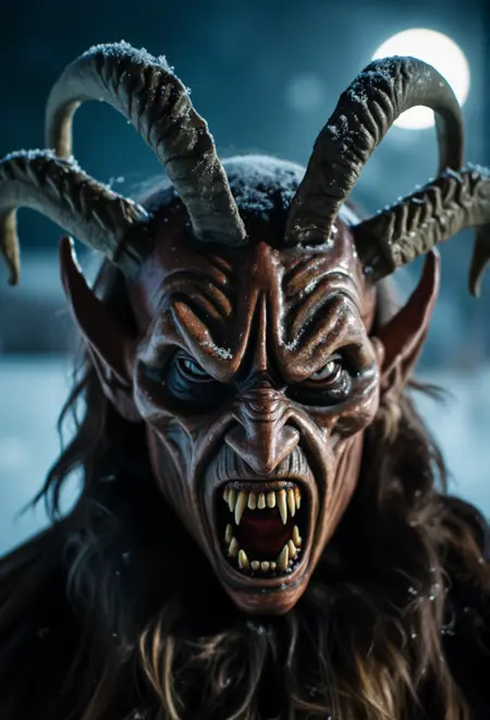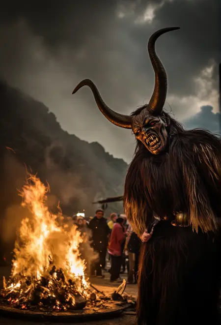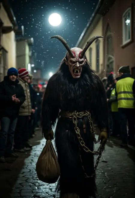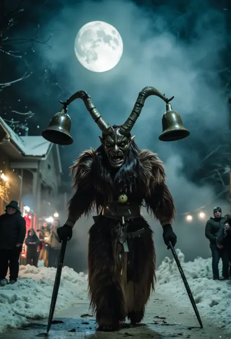 Krampus是阿尔卑斯民间传说中的神话人物,在奥地利、德国和中欧地区广为人知。与奖励乖巧孩子的圣诞老人不同,Krampus是一个长着角的生物,专门惩罚顽皮的孩子。他通常被描绘为身披黑色毛发、头生犄角、面容狰狞,手持链条和桦树枝,用来抽打顽童。