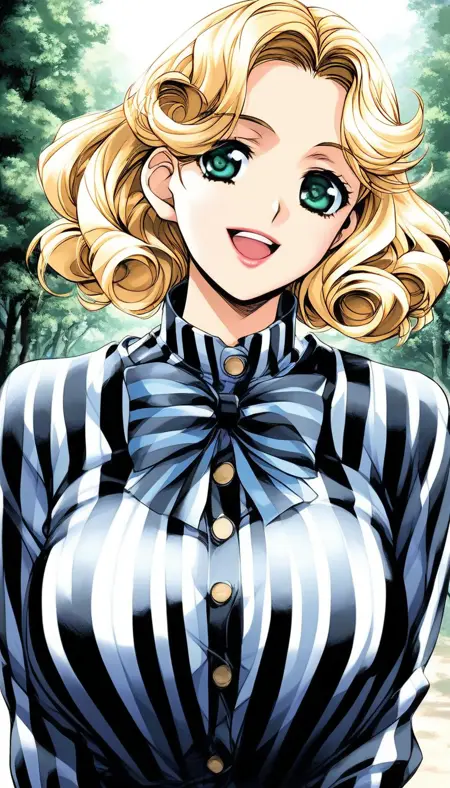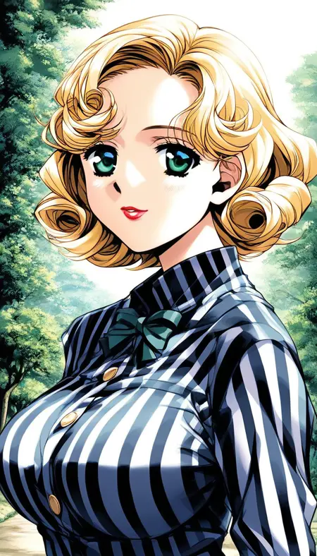 Sakakibara_Miyuki(Doukyuusei2), 1girl, solo, blonde hair, green eyes, curly hair, short hair, large breasts, pink lipstick,