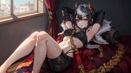 If you want her outfit you need to prompt it using tags such as: gloves, black gloves, elbow gloves, fur trim, jewelry, shorts, black shorts, cape