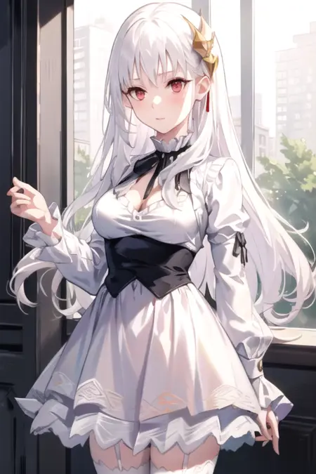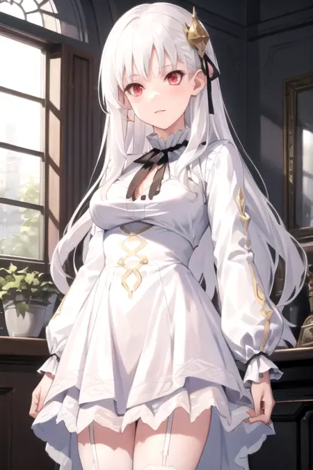 FilliaFate, 1girl, solo, long hair, hair ornament, red eyes, white thighhighs, long sleeves, white dress, medium breasts, white hair, pink eyes, black ribbon, neck ribbon