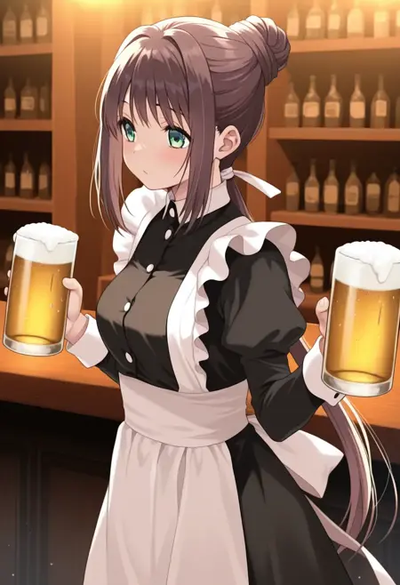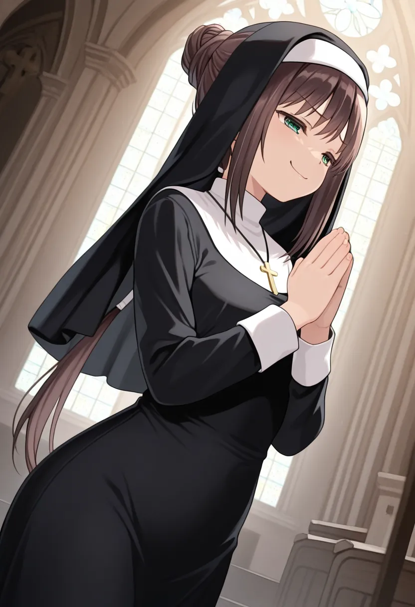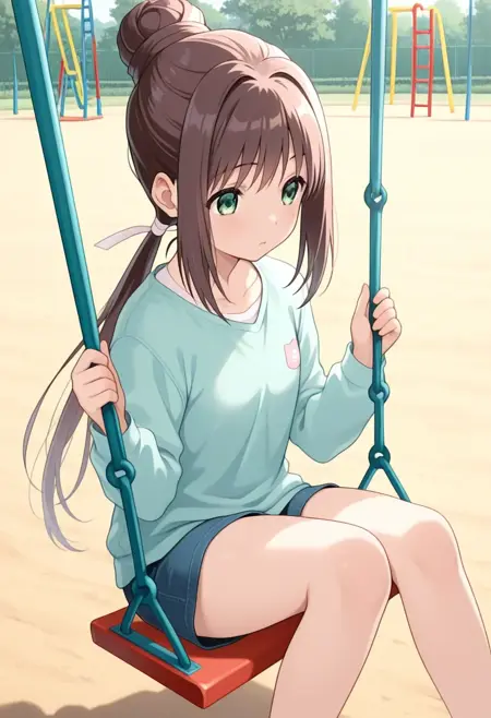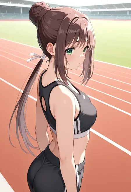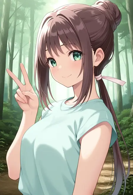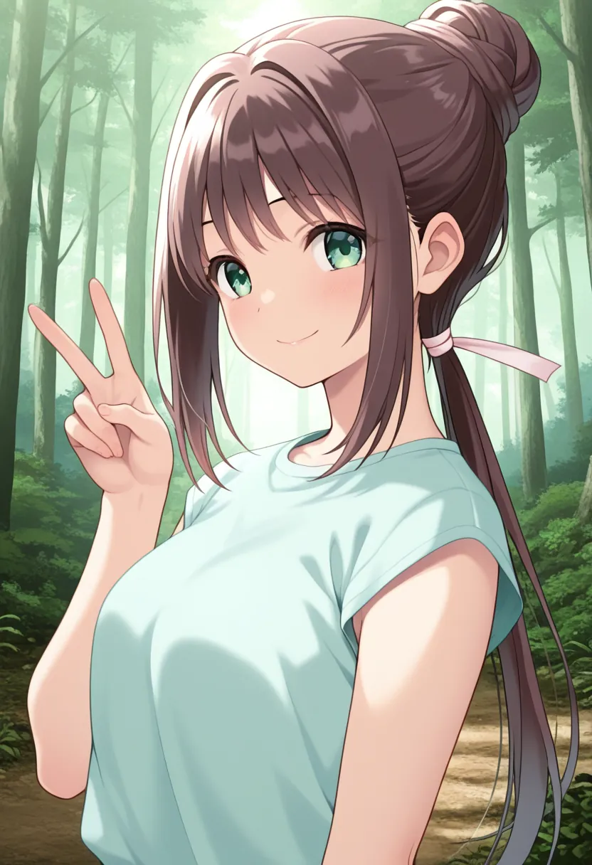 Nanase Ren, 長い髪, 茶色の髪, ポニーテール, 髪の結び目, 緑の目,