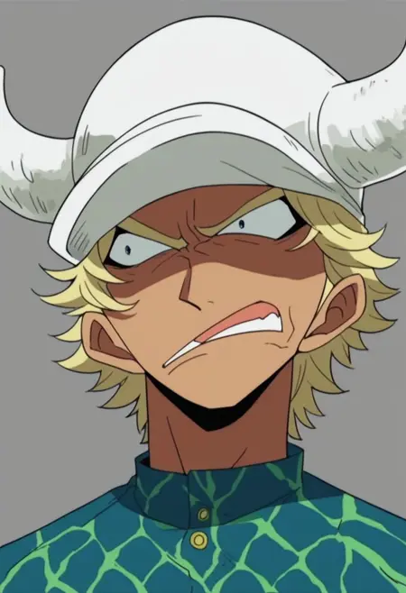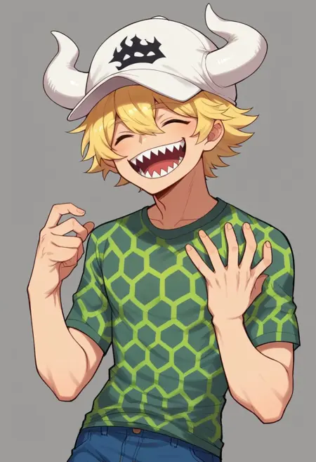blonde hair, wearing a green and gray hexagonal patterned shirt, long sleeve, blue short shorts, large white horns on his head, white hat,