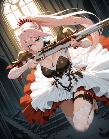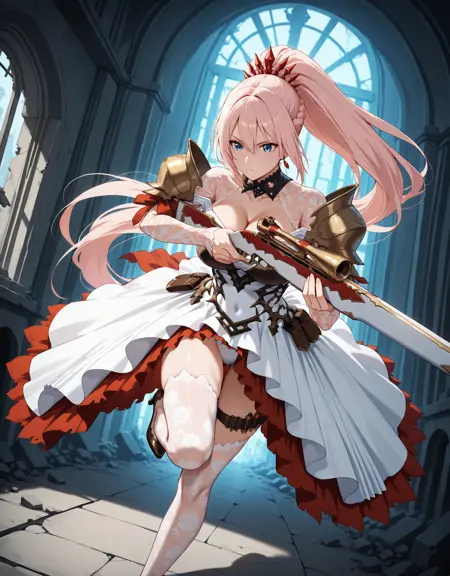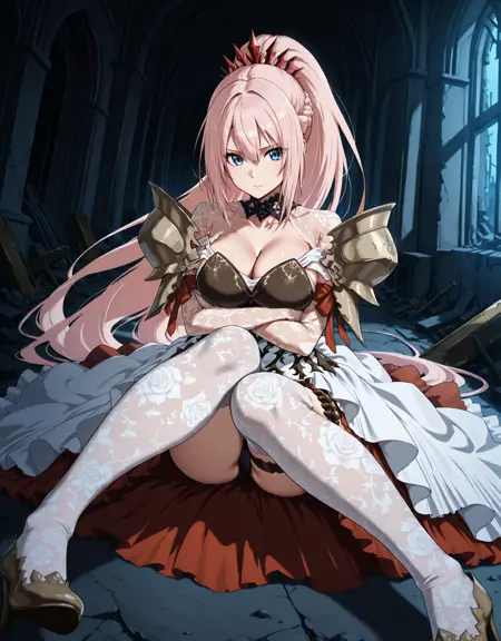 1girl,shionnev01,cleavage,collarbone,white dress,see-through,large breasts,thighhighs,bangs,hair between eyes,very long hair,braid,white thighhighs,print thighhighs,(thigh strap:0.8),(bandolier:0.8),high heels,gloves,armor,( shoulder armor:0.8),breasts_armor,(skindentation:0.7),(red skirt:0.9),earrings,white panties,