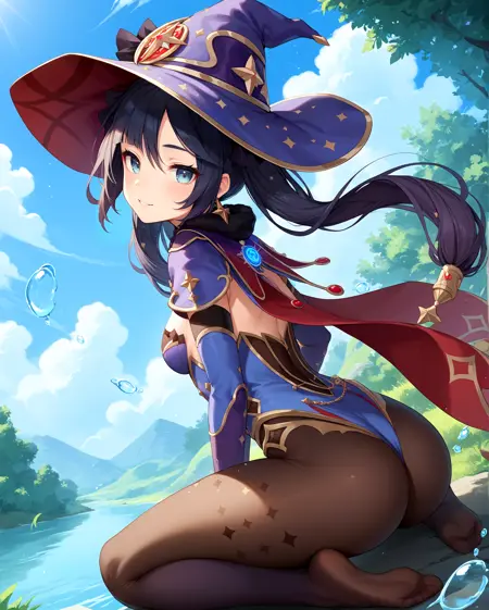 기본 복장: 마녀 모자, 팬티스타킹, 목걸이, 파란 레오타드, 검은 장갑, 분리형 소매, 망토,