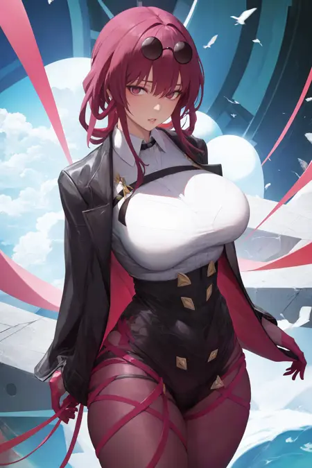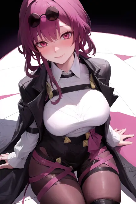 복장: 선글라스, 머리에 안경, 재킷, 흰 셔츠, 팬티스타킹, 부츠