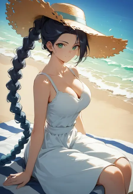 我知道处理头发真的很麻烦……因为她辫子末端绑着一把短刀,我很难让AI足够灵活地学习这一特征。你可以尝试添加 dagger tied to hair,但效果不会很好,很抱歉。