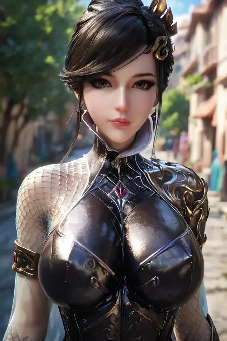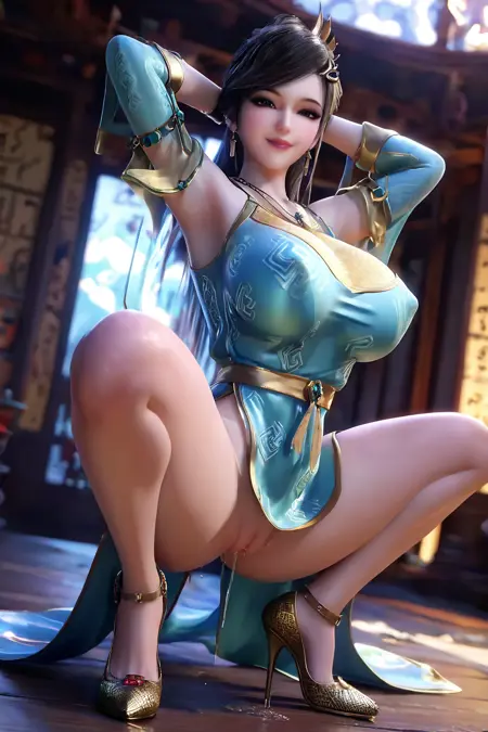 jing ni,black hair,black eyes,hair ornament,high collar,bodysuit,pantyhose,fishnets,fishnet pantyhose,dress