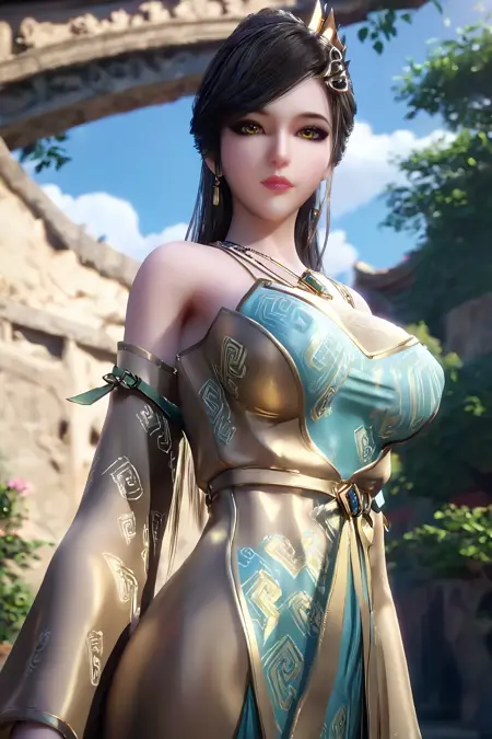 jing ni,black hair,black eyes,chinese clothes, yellow chinese clothes, long hair, detached sleeves, bare shoulders, dress, jewelry