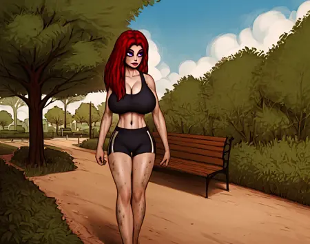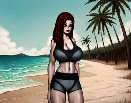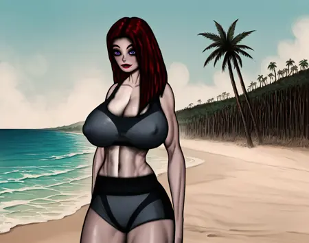 (1girl, long hair, red hair, solo, purple eyes, grey skin, angelina, light red eyeshadow, red lipstick)