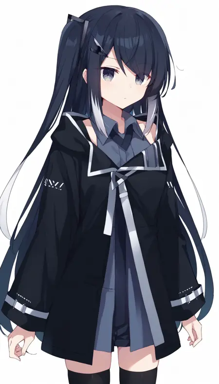 millial (coefont), 검은 코트, 검은 머리, 검은 반바지, 검은 허벅지 양말, 코트, coefont, 칼라 셔츠, 회색 눈, 회색 셔츠, 긴 머리, 긴 소매, 다색 머리, 셔츠, 반바지, 허벅지 양말, 이색 머리, 날개 칼라, lora:allial_millial_pony_v1:0.8