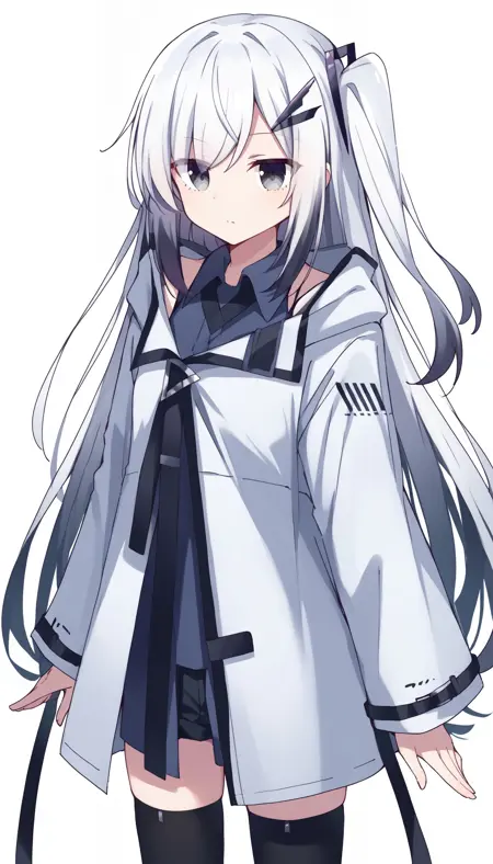 allial (coefont), 검은 반바지, 검은 허벅지 양말, 코트, coefont, 회색 눈, 머리 장식, 헤어클립, 후드, 후드 아래로 내린 상태, 후드 코트, 긴 머리, 긴 소매, 미니 반바지, 한쪽만 올린 상태, 반바지, 허벅지 양말, 흰 코트, 흰 머리 lora:allial_millial_pony_v1:0.8