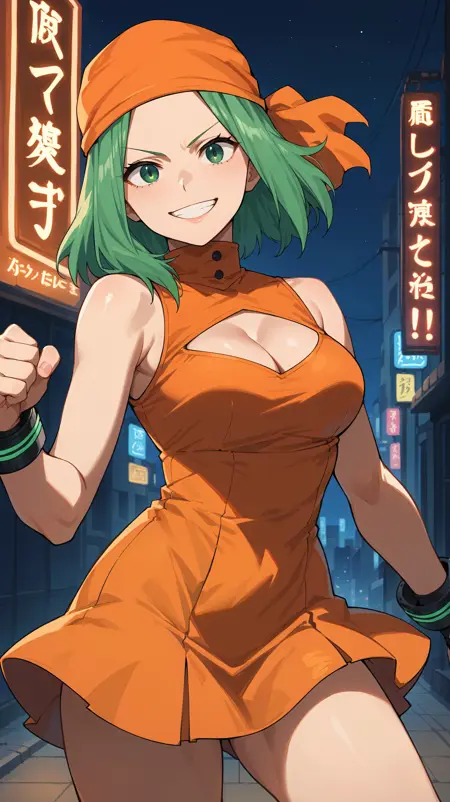 medium hair, green hair, green eyes, orange bandana, black top, sleeveless, orange gloves, white belt, shorts, orange pants, green pants, striped pants, multicolored pants, black corset