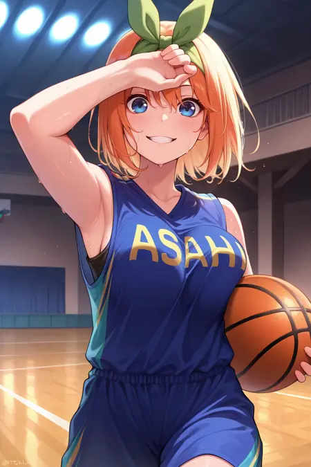 衣装4:緑のリボンヘアバンド、バスケットボールユニフォーム、青いシャツ、ノースリーブシャツ、青いショートパンツ
