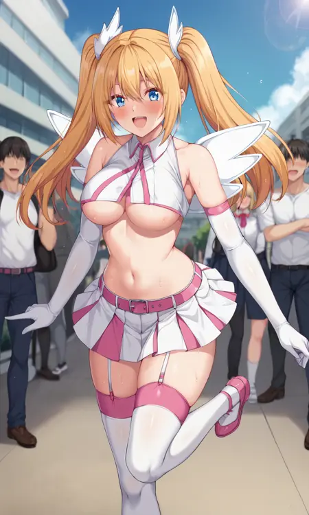 角色cosplayschool uniformanime characterangel wingssdxl 1,0ponyxllilielamano ririsaririsa amanolilieloutfit1,miniskirt, white thighhighs, long sleeves, detached sleeves, navel, pleated skirt, angel wings, midriff, crop top, underboob, garter straps, white wings, wing hair ornament, pink belt, wings, under boob, belly, garter belt, thighhighs,lilisa